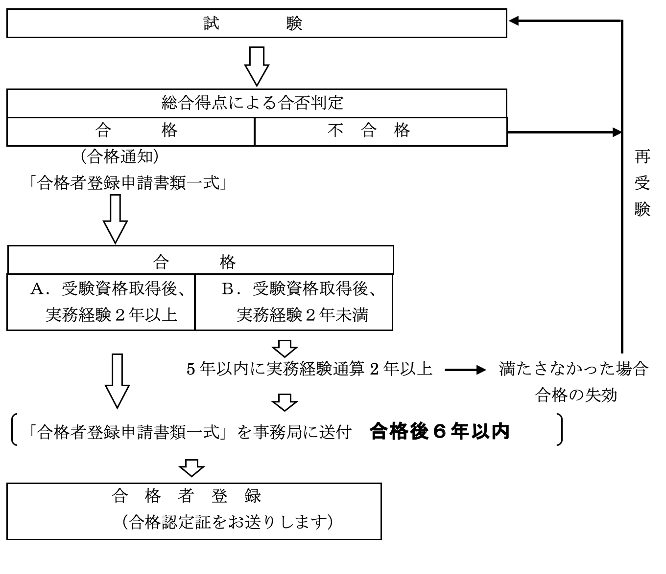 - 実務経験2年に満たない方は、合格後5年以内に2年の実務を修了し、その実務経験を示す証明書を提出することにより合格者認定原簿に登録され、「合格認定証」が発行されます。